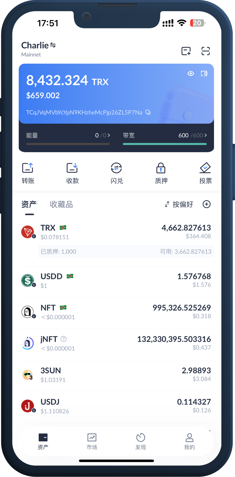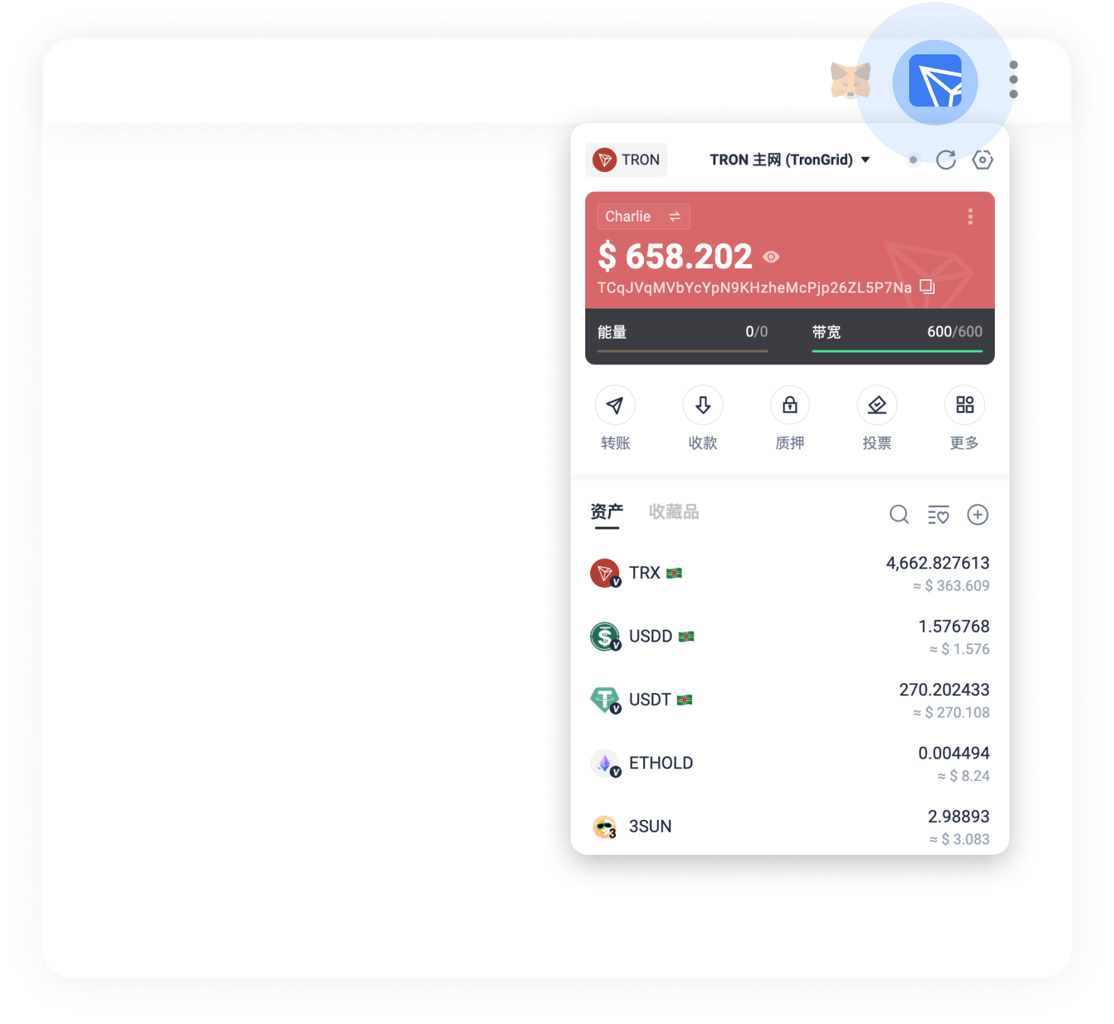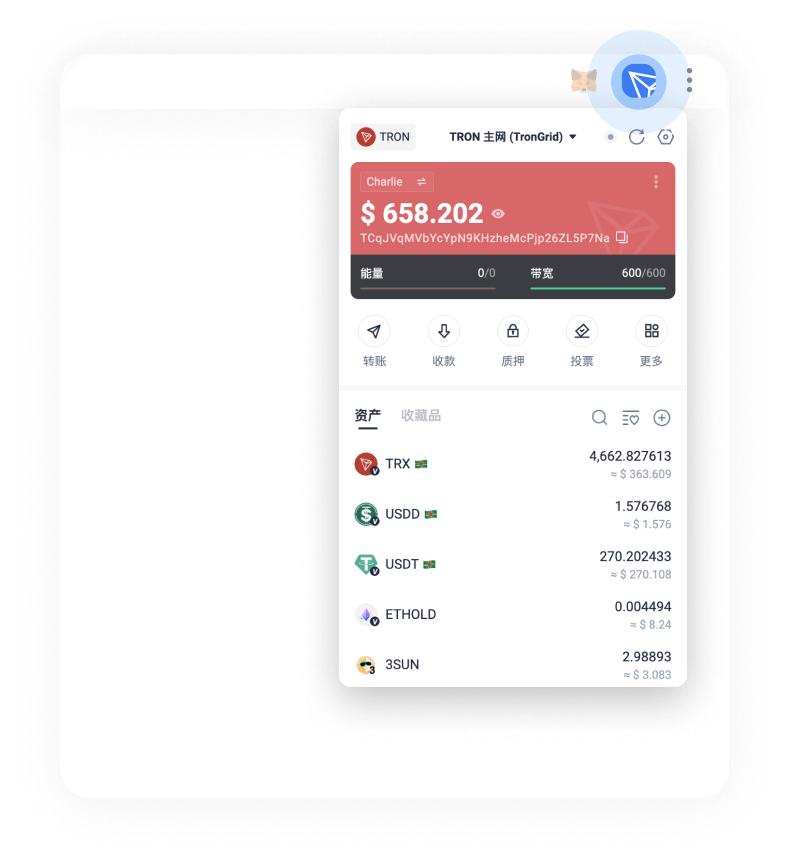 深度支持 TRON 网络:支持 TRX 以及 TRC10、TRC20、TRC721 等币种,支持特色的质押获取资源及代理资源机制;